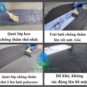 - Quét lớp chống thấm thứ nhất lên vết nứt, sao cho phủ kính vết nứt với đường kính lớn hơn kích thước lưới Polyester. Để khi trải lưới đạt hiệu quả chống thấm