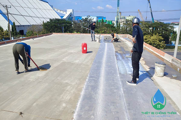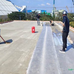 - Bước 2: Sau khi bề mặt thi công hoàn tất, tiến hành quét vật liệu chống thấm lớp 1, với định mức thấp nhằm tạo quá trình bán dính vải thủy tinh và thẩm thấu bề mặt